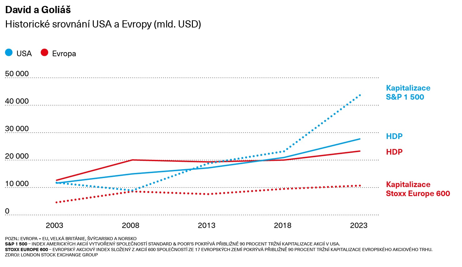 Podobný obrázek ukazuje srovnání poměru hrubého domácího produktu a hodnoty finančních trhů měřené akciovými indexy S&P 1500 a Stoxx Europe 600. Prostým podílem čísel uvedených v grafu David a Goliáš lze zjistit, že kapitalizace firem zahrnutých do amerického indexu S&P 1500 přesahuje HDP USA o více než 57 procent, zatímco kapitalizace evropského indexu a Stoxx Europe 600 neodpovídá ani polovině HDP zemí starého kontinentu.
