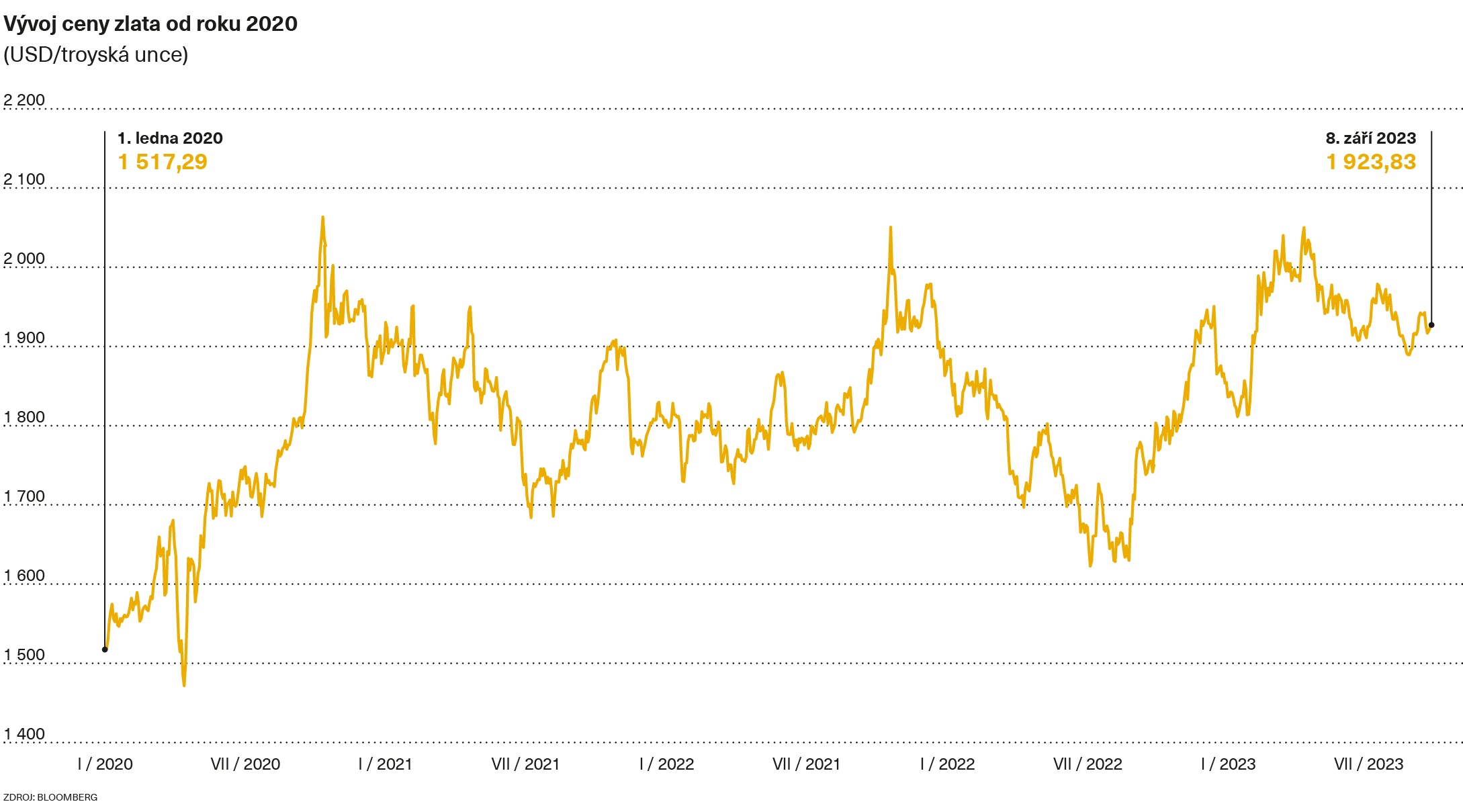 Cena zlata se letos vyhoupla nad psychologickou úroveň 2 000 dolarů za troyskou unci v dubnu a pak také v první půli května. Stalo se tak vůbec poprvé od loňského března, tedy od začátku ruské invaze na Ukrajinu. V historii se unce zlata prodávala za více než 2 000 dolarů pouze loni krátce po zahájení invaze, tedy v první polovině března, a pak přechodně v části srpna roku 2020, kdy se svět obával dopadů pandemie covidu-19, na nějž tehdy ještě neexistovala účinná vakcína.