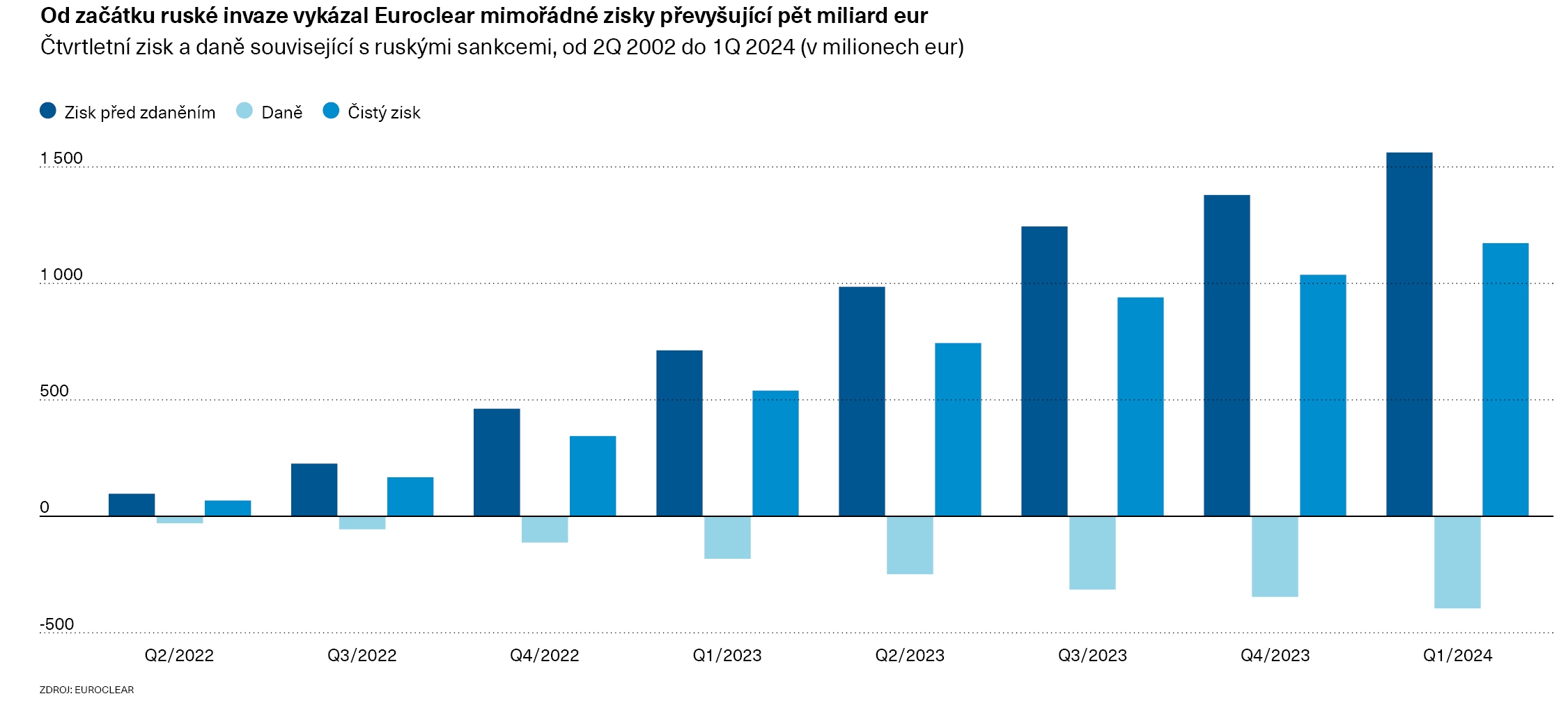 Společnost Euroclear od začátku války dosáhla mimořádných zisků po zdanění ve výši více než pěti miliard eur (123,6 miliard korun), neboť reinvestuje zmrazené kuponové platby a hotovost ze splatných cenných papírů, jež nemohou být kvůli sankcím vyplaceny Rusku. EU má však s těmito penězi jiné plány. Podle návrhů, které mají být přijaty dle informací listu Financial Times v nadcházejících týdnech, bude většina současných a budoucích zisků z ruských aktiv v držení Euroclearu použita především na společný nákup zbraní pro Ukrajinu. Veškeré zisky vytvořené do poloviny února budou ponechány společnosti Euroclear jako rezerva na právní náklady a rizika.